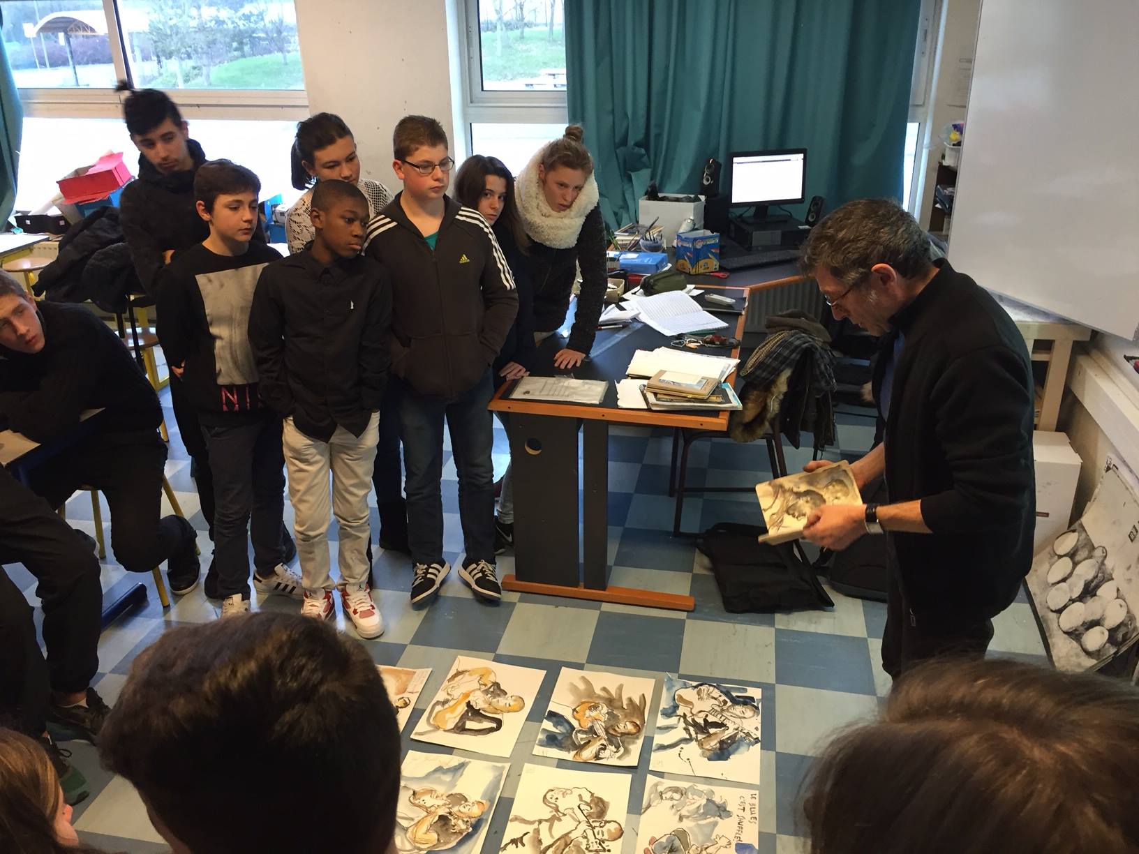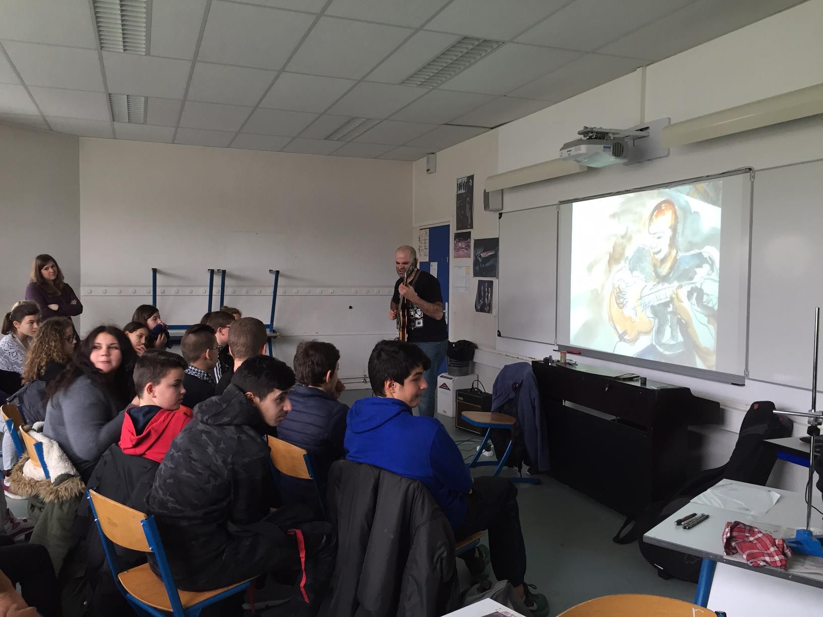 Pierre Durand en live dans la salle de musique du collège et les dessins instantanés de Didier Locicero projetés sur le tableau.