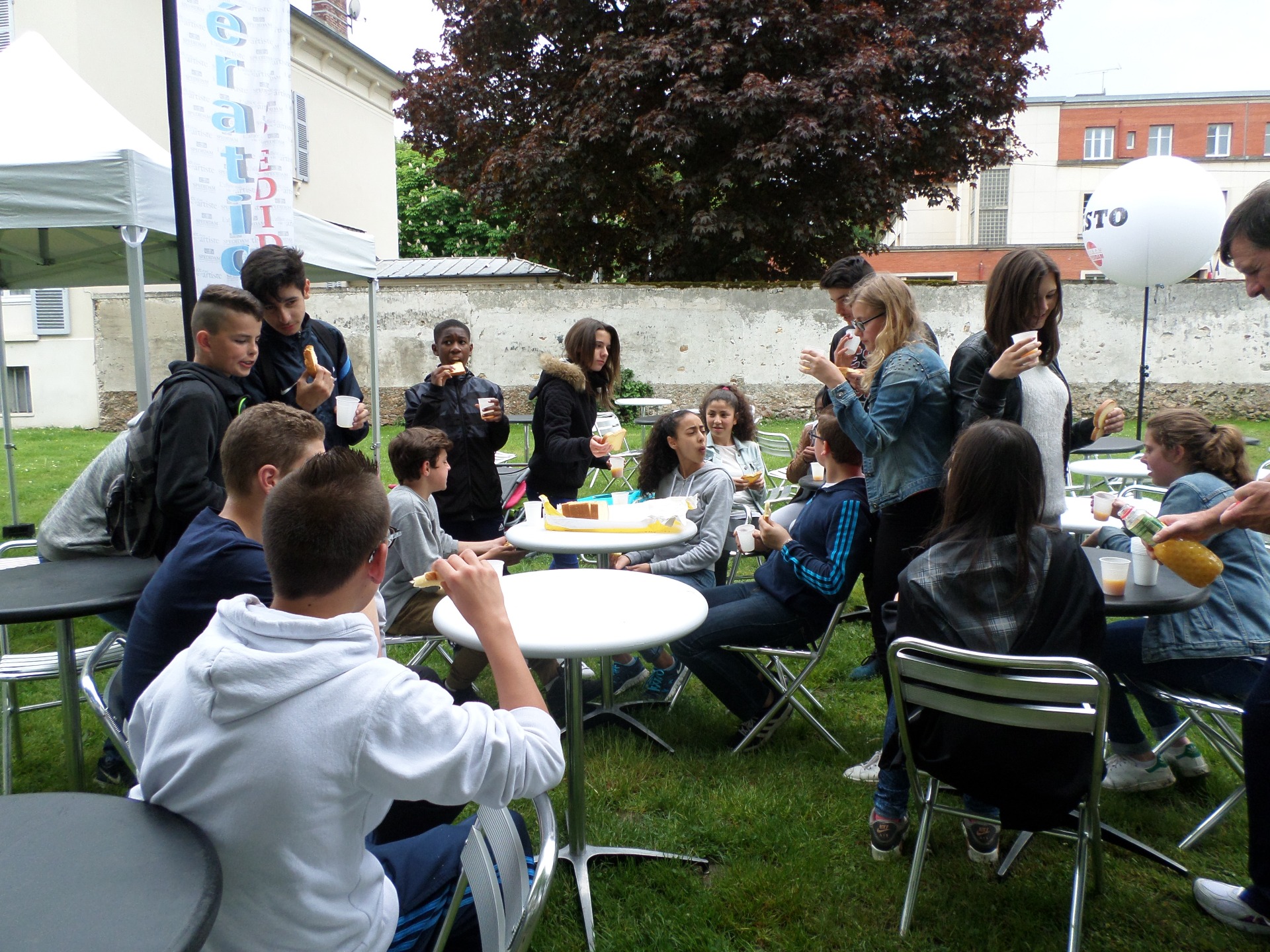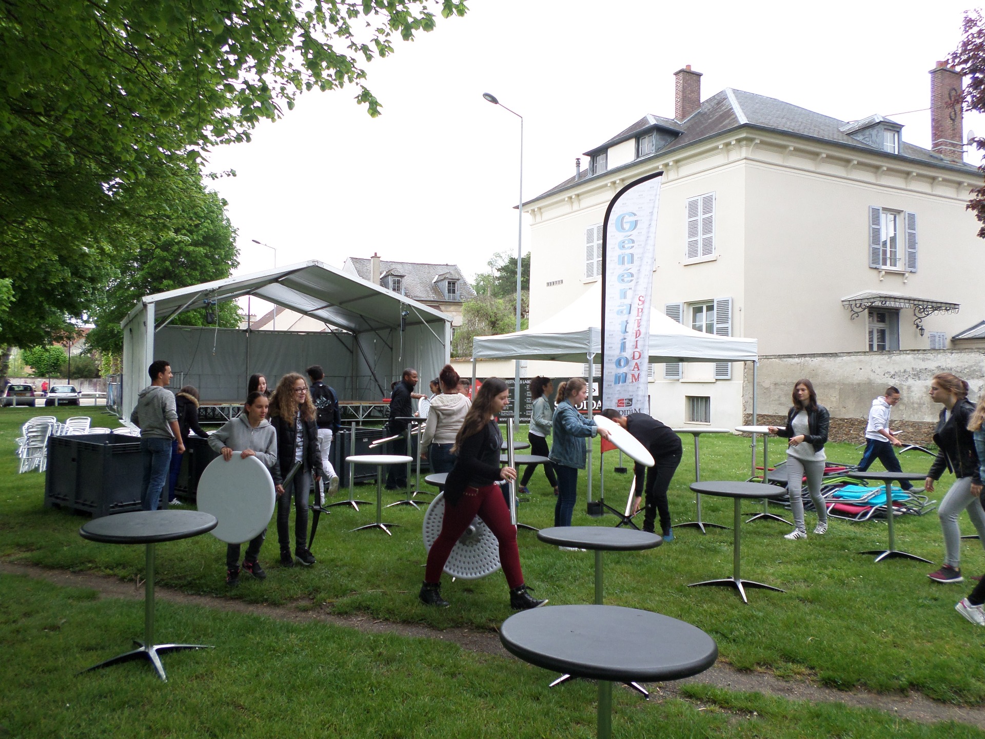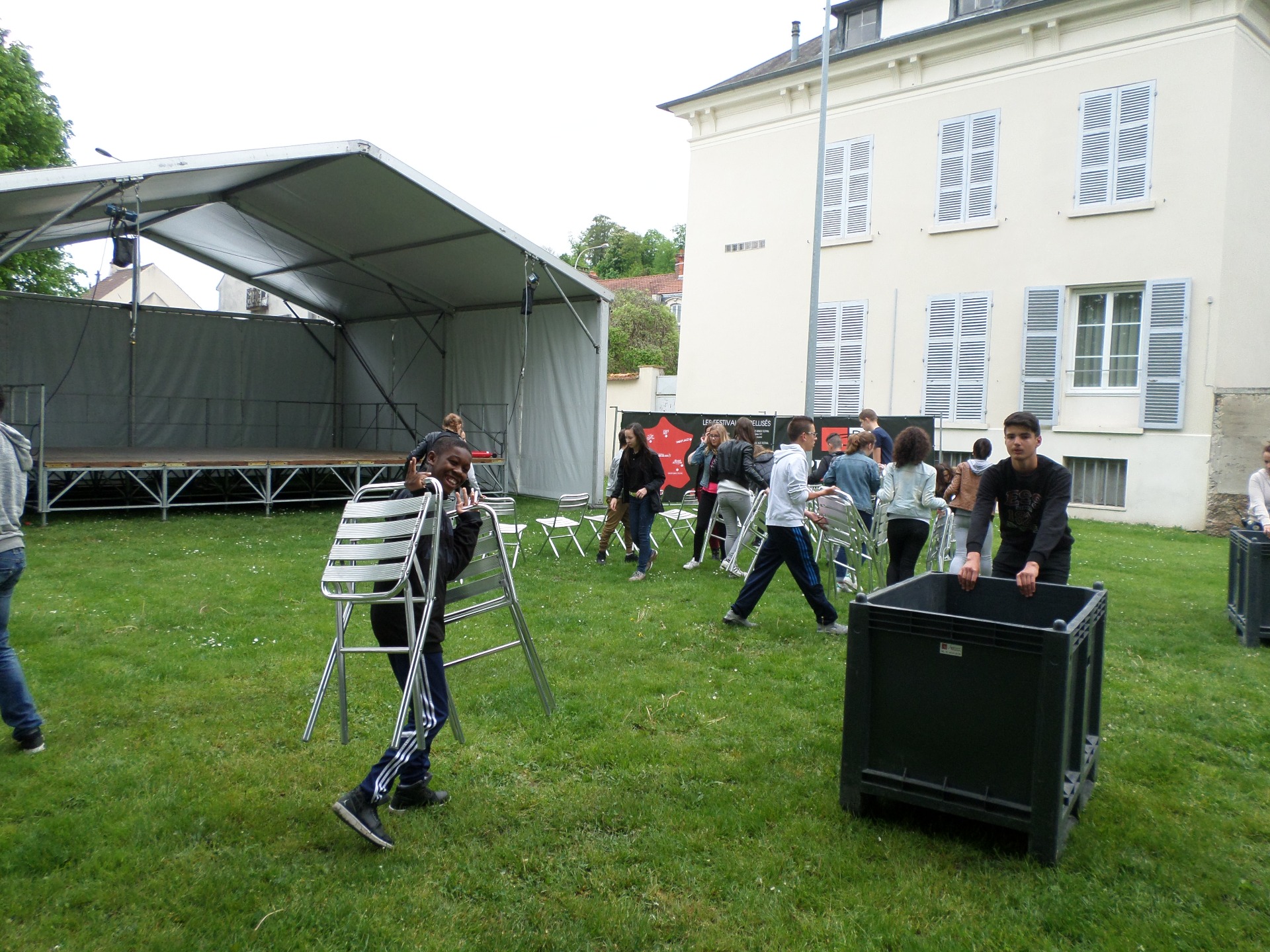 Ensuite, nous (sauf Lucas qui était trop occupé à nous encourager) avons aidé les responsables et bénévoles à installer les tables et les chaises autour de la scène de l'esplanade. Merci à Marion pour la visite, le jus d'orange et la brioche !