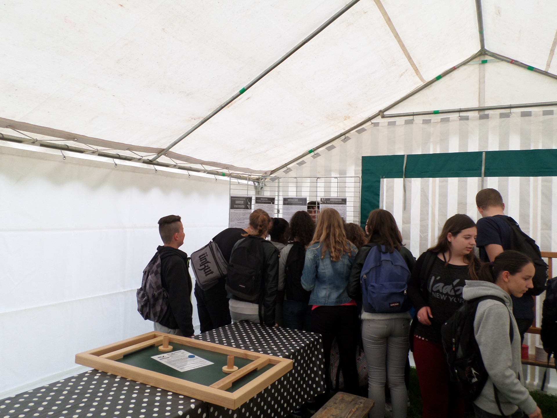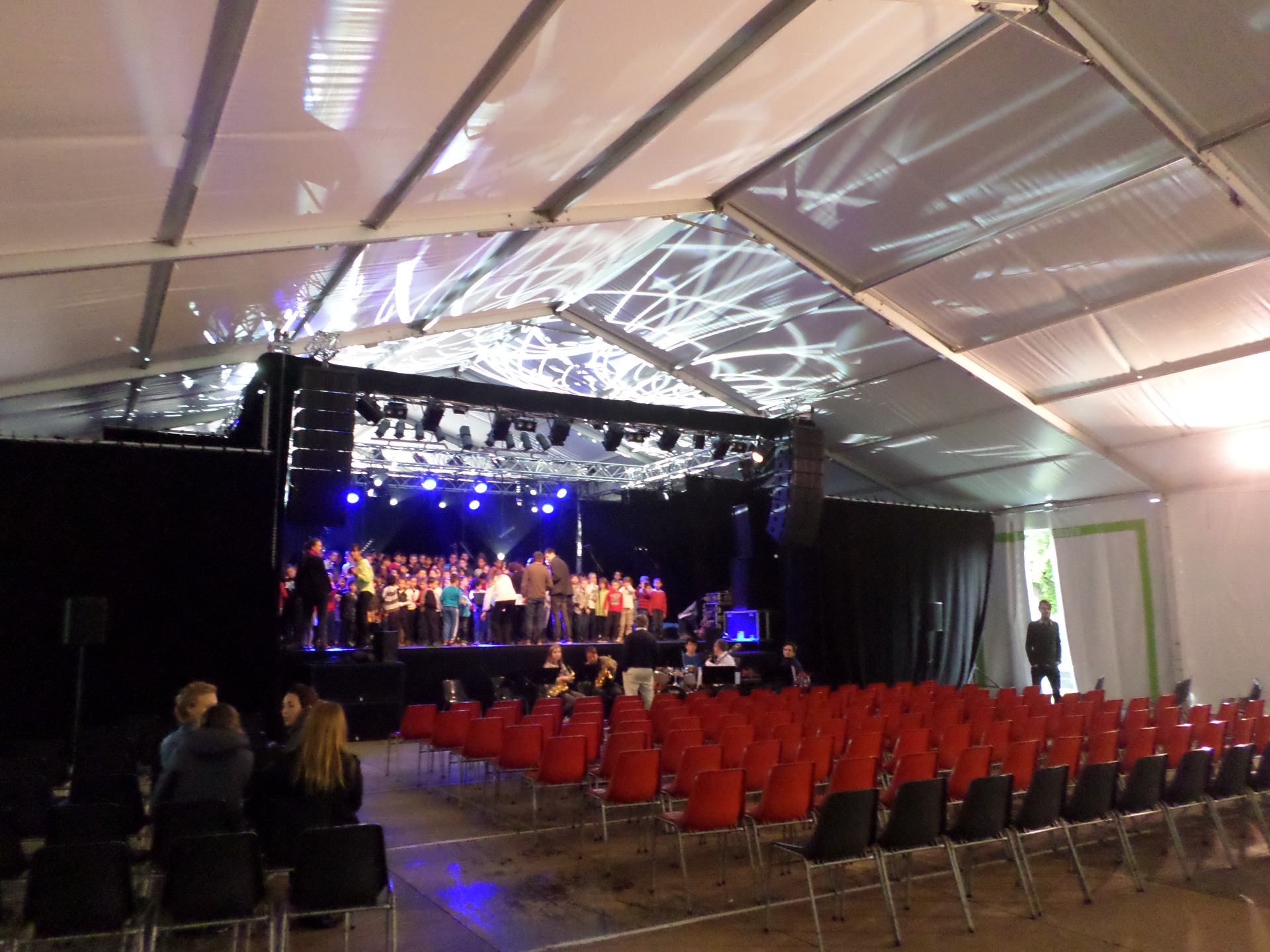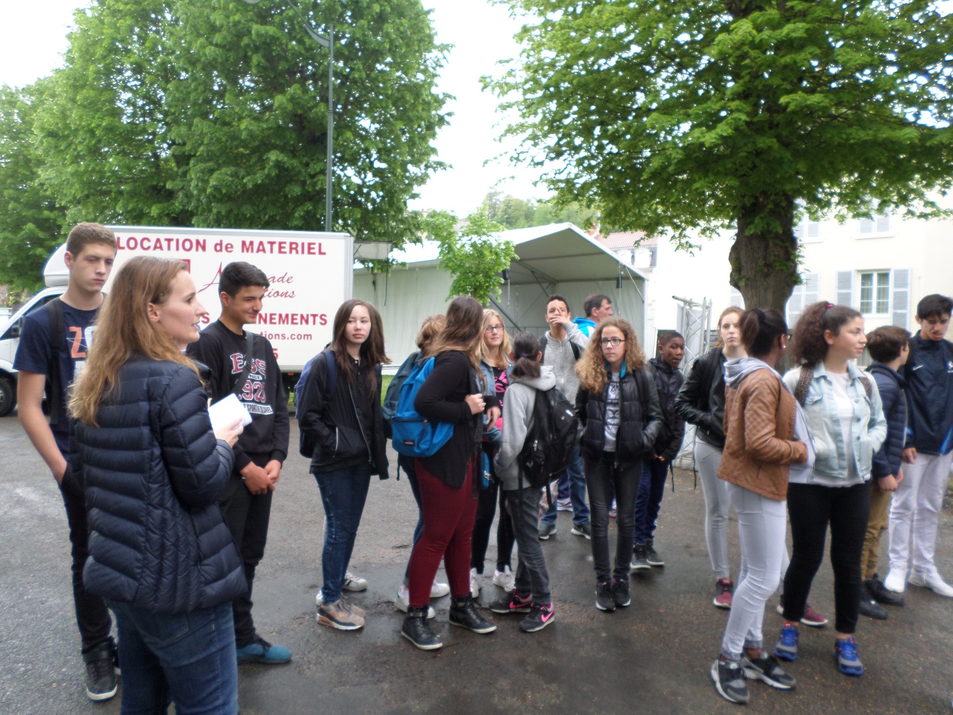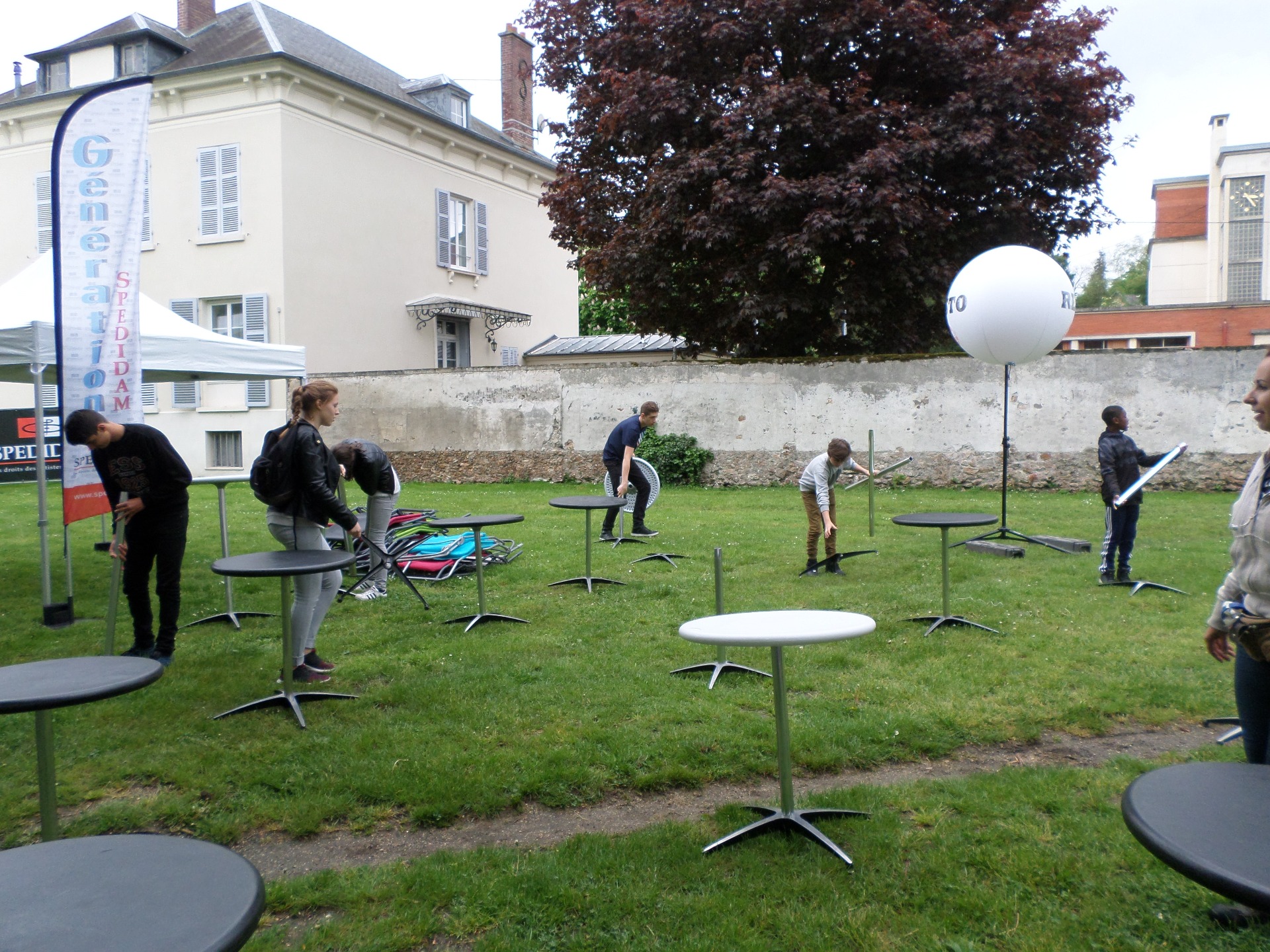 Ensuite, nous (sauf Lucas qui était trop occupé à nous encourager) avons aidé les responsables et bénévoles à installer les tables et les chaises autour de la scène de l'esplanade. Merci à Marion pour la visite, le jus d'orange et la brioche !